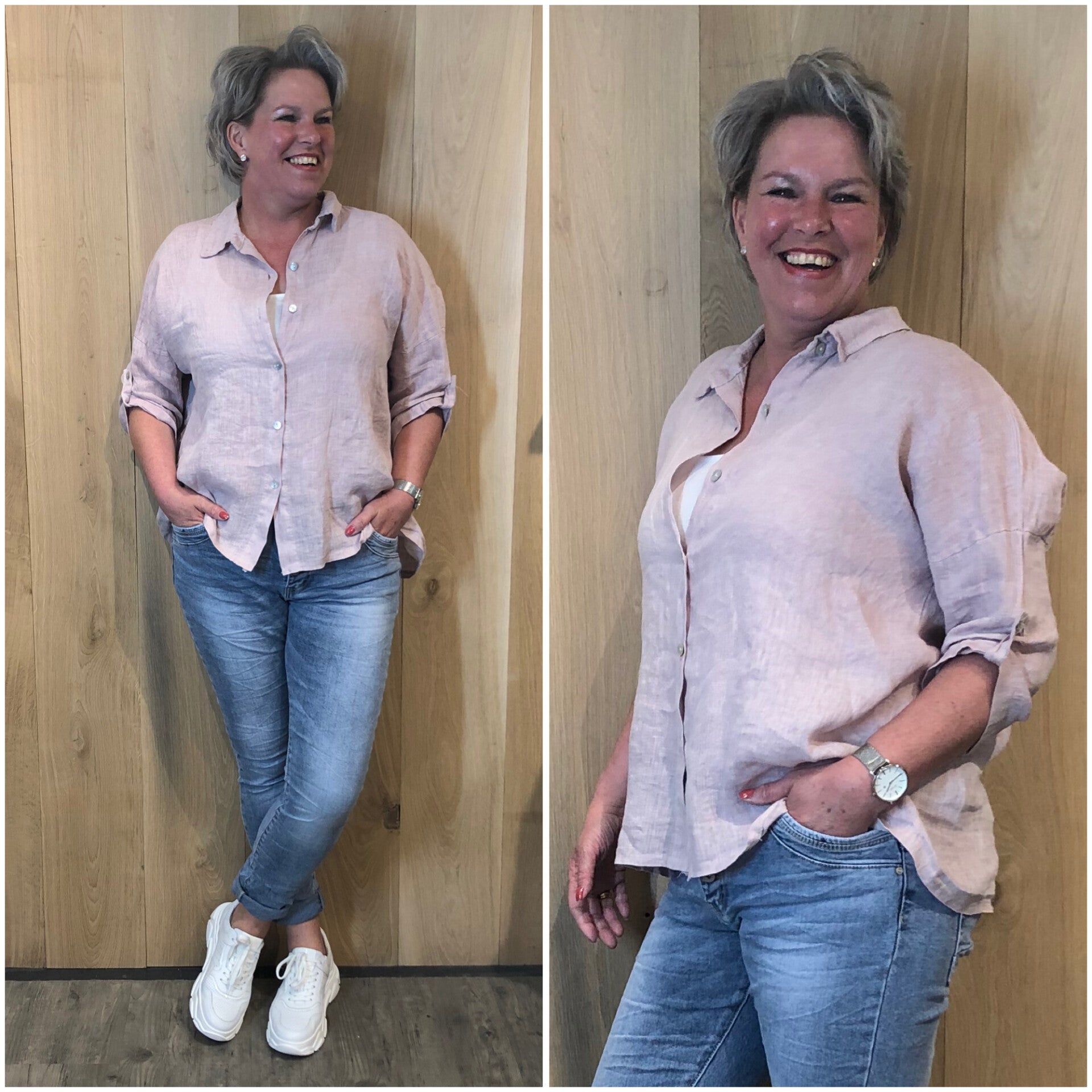 Leuke blouse 100% Linnen met een kraag en ophaal met een knoopje op de mouwen.